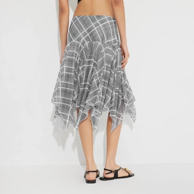 Add this Women’s Mesh Asymmetrical Skirt – Wild Fable™ to your casual wear collection. Crafted from high-stretch mesh fabric with a bold plaid print, this A-line skirt blends statement style with effortless wearability. The high-waist design and asymmetrical hem create a flattering silhouette, elongating the legs for a sleek look. Lightweight and flowy, it pairs seamlessly with crop tops for a modern, fashion-forward outfit.