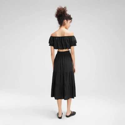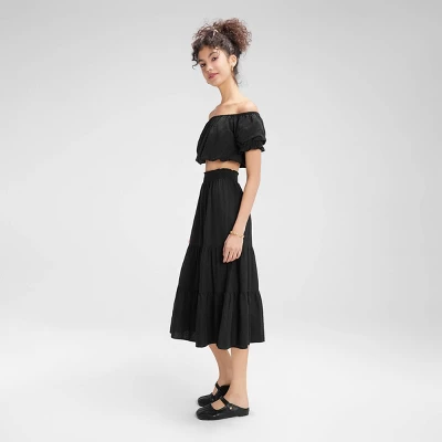 Off-the-shoulder top with trendy puff sleeves. Features a romantic abstract print for a playful, charming look. Pairs perfectly with the matching skirt for a date-ready ensemble in spring and summer.